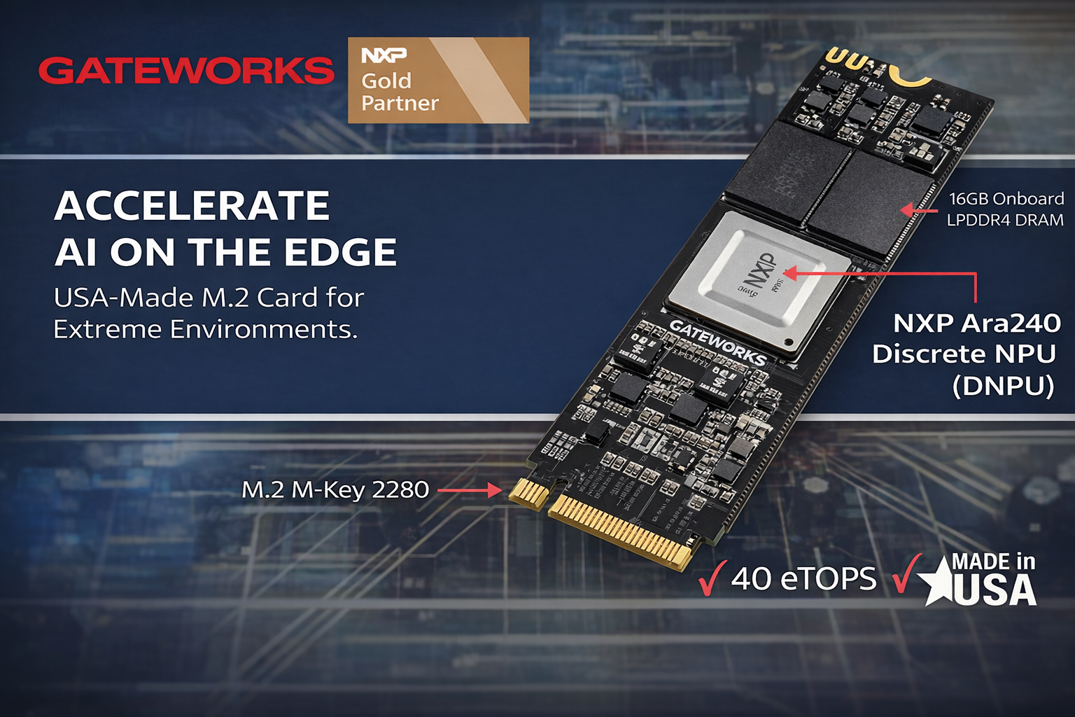 Gateworks and RoundSolutions introduce the GW16168 Edge AI Accelerator, designed to bring powerful AI processing to industrial embedded systems and available through RoundSolutions.Powered by the NXP ARA240 Neural Processing Unit, the module delivers up to 40 eTOPS of AI computing performance. Installed via the M.2 PCIe interface, the accelerator enables developers to run complex AI models directly on Gateworks Single Board Computers without relying on cloud infrastructure.This allows real-time data processing at the edge, reducing latency while improving reliability and security in industrial deployments.The GW16168 is designed for demanding embedded environments and supports modern AI frameworks such as TensorFlow, PyTorch, and ONNX, making it easier to deploy machine learning models directly on industrial devices.Typical Applications• Machine vision systems• Industrial automation• Robotics and autonomous systems• Predictive maintenance• Smart infrastructure and edge analyticsKey Features• NXP ARA240 AI accelerator with up to 40 eTOPS performance• M.2 M-Key 2280 form factor with PCIe interface• 16GB LPDDR4 memory for large AI models• Support for TensorFlow, PyTorch, and ONNX• Industrial temperature range −40°C to +85°CAs an official Gateworks partner, RoundSolutions provides customers with access to Gateworks industrial SBC platforms, AI accelerator hardware, and engineering expertise for embedded AI and Industrial IoT deployments.Our team supports system integrators and developers with hardware selection, integration support, and connectivity solutions for demanding industrial environments.